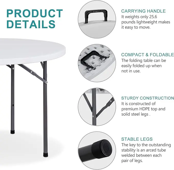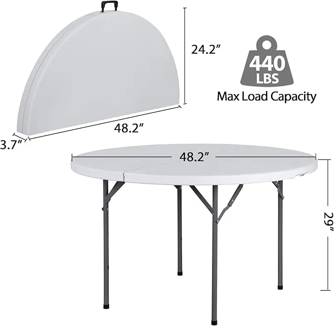 Space-Saving Foldable Design: The 48-inch plastic folding round table folds flat for easy storage, transportation, and warehouse optimization.
