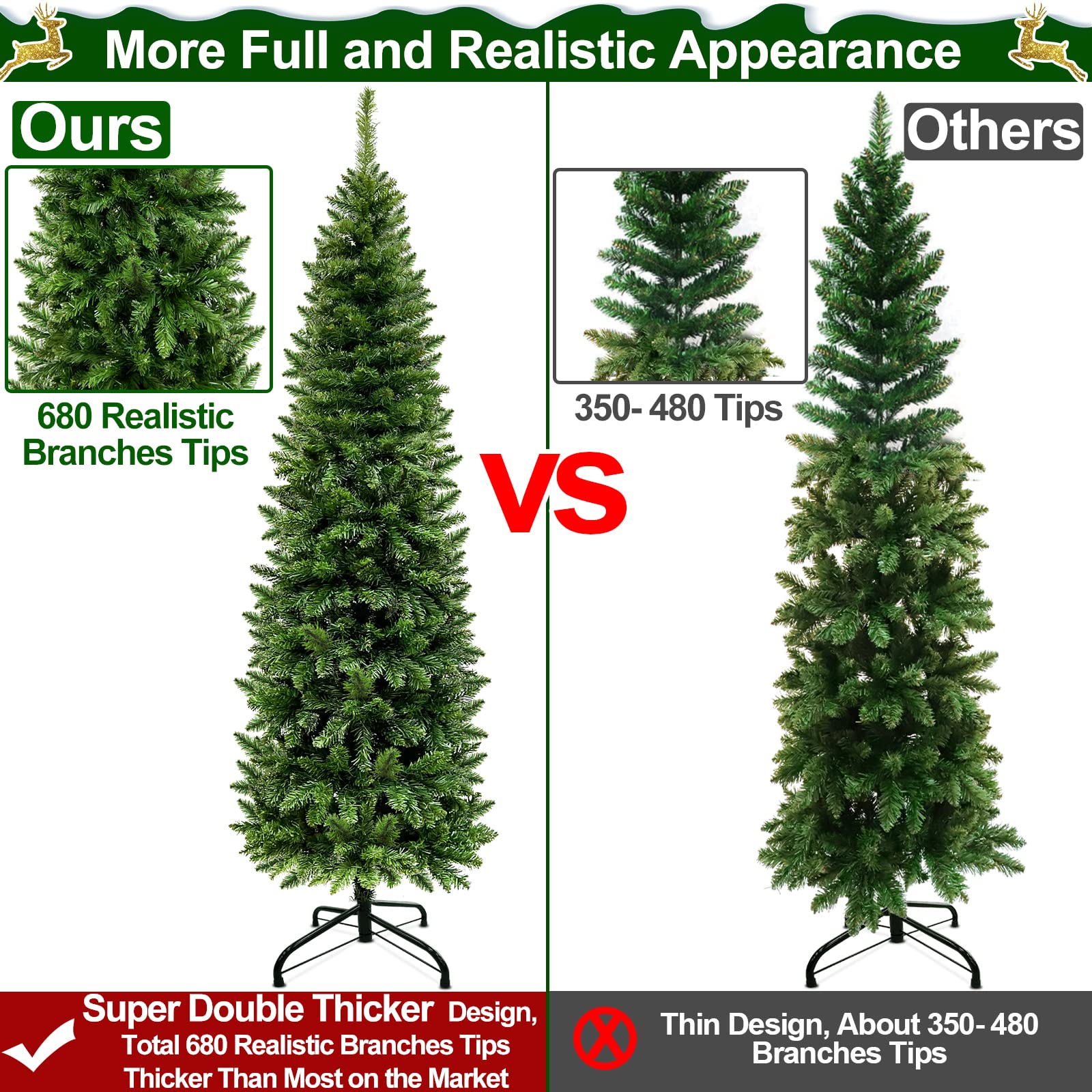 Stable metal support and stability: This 6.5 FT ODM Artificial Slim Christmas Tree and metal support material. The branches are fire resistant, durable and sturdy.