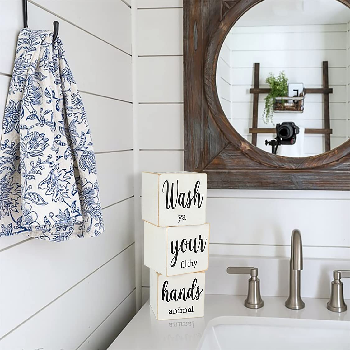 【FARMHOUSE BATHROOM DÉCOR】- Bathroom Tabletop Supplier make this farmhouse block decoration with rustic wooden appearance is also a definitely unique farmhouse bathroom decor, which could bring classical feeling for your bathroom. Put this farmhouse decoration on the sink, toilet tank, bathroom table, countertop, desktop, floating shelves, or on any place you like to create an elegant and retro scene in the bathroom.
