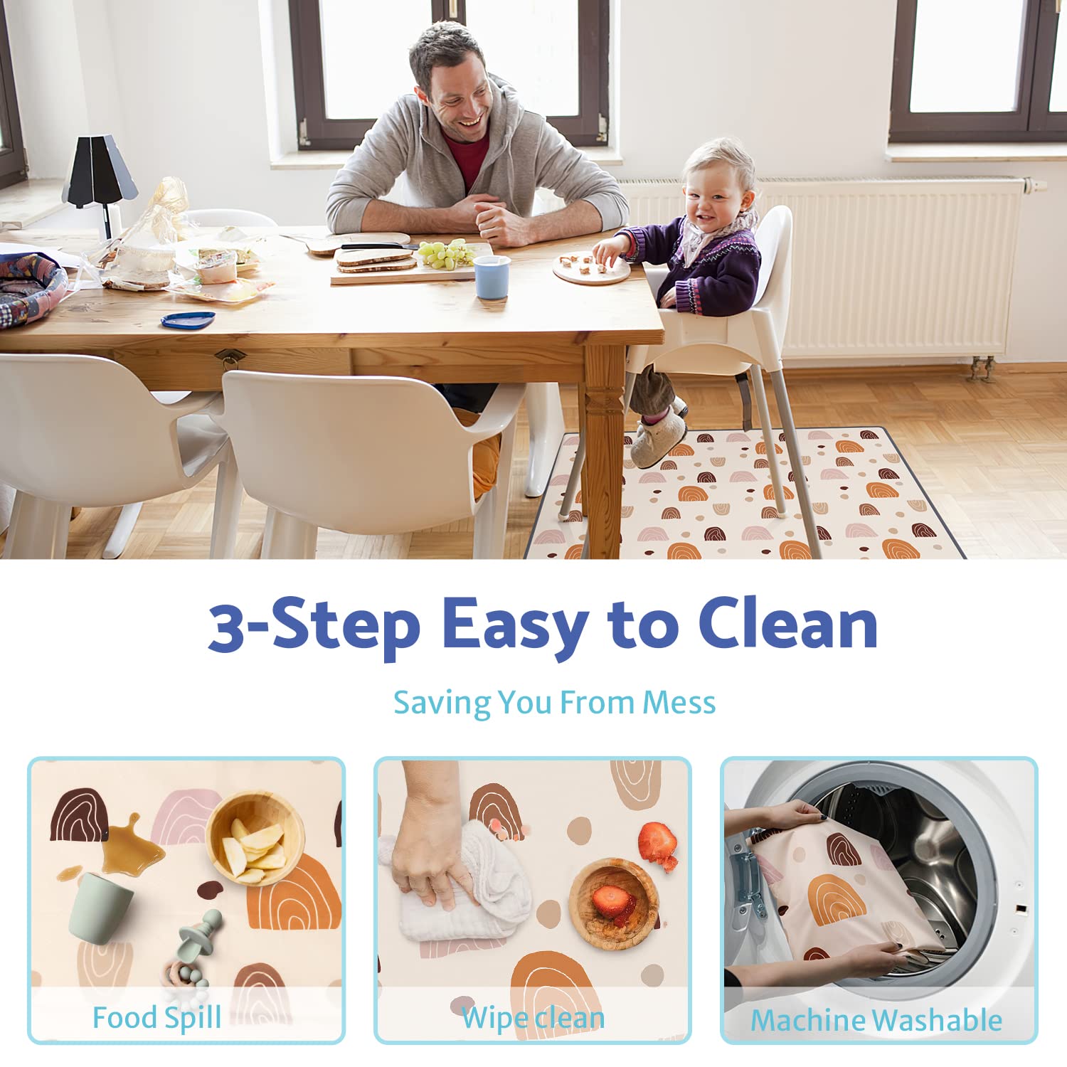 Anti-Slip Bottom: The high chair mat features anti-slip dots on the bottom that keep the mat in place. The splat mat is not easy to move on the floor, keeping the safety of the baby and mom.