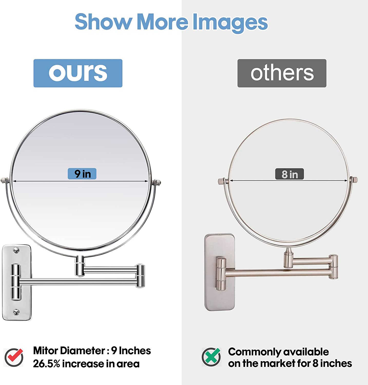 Our wall-mounted vanity mirror arm length is up to 12 inches, can be extended according to your needs and folded out of the way against the wall when not in use. The magnifying makeup mirror with extending arm can save space effectively, and you don’t need to stoop close to the magnified makeup mirror.