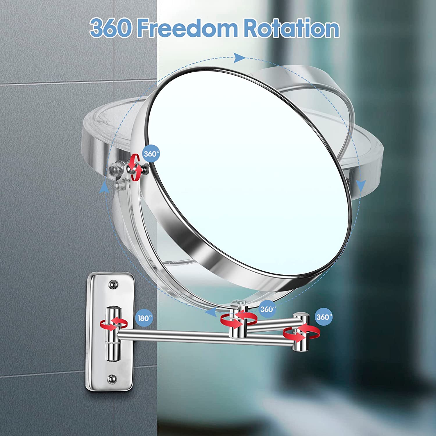 Our wall-mounted magnifying mirror is designed with a strong and durable U-shaped support frame that connects the mirror and allows for 360-degree freedom rotation. Easily find a suitable position to apply your makeup or other beauty maintenance needs.