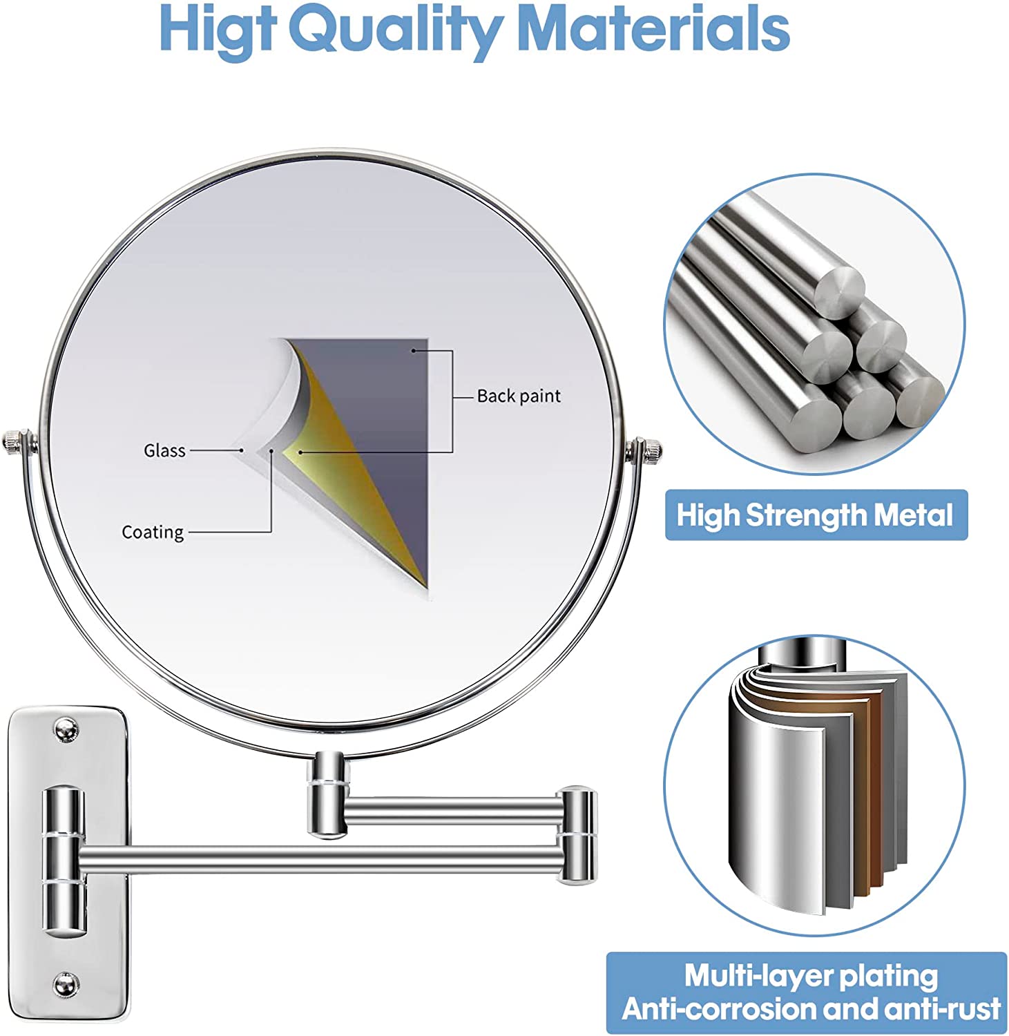 Our double-sided vanity mirror is made of high-quality metal materials and HD glass, making it sturdy, durable, and aesthetic. The surface of the metal frame and base of the mirror is chrome plated, giving it a shiny and exquisite look. NOTE: Our wall mirror has NO LIGHT and is bright silver.