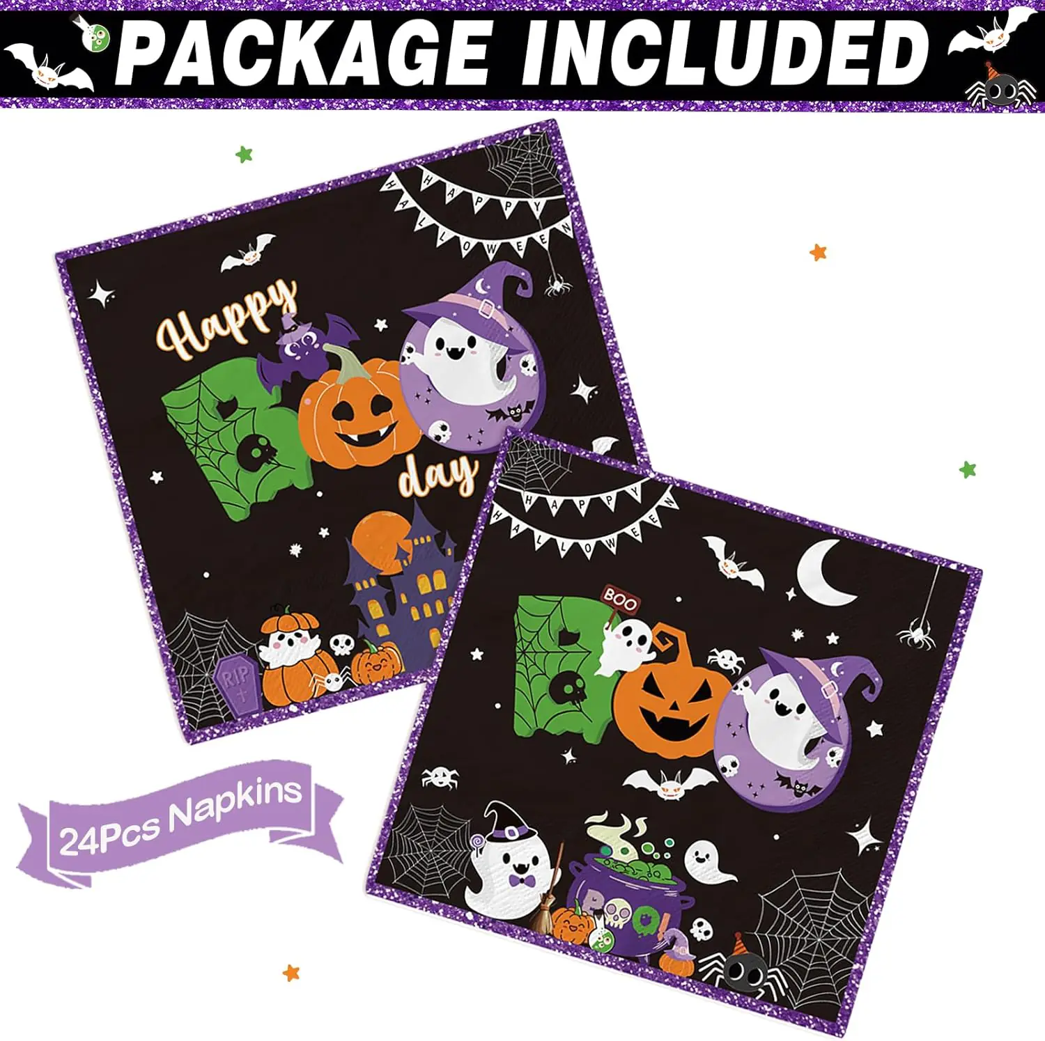 This all-in-one Halloween party set provides a complete wholesale solution for 50-guest events. You will receive 1 banner, 24*7″ plates, 24*9″ plates, 24 napkins, 72*plastic spoons, forks, knifes , 24*paper cups, 1 tablecloth—all featuring coordinated Halloween designs with ghosts, pumpkins, and haunted castles. Ideal for wholesalers supplying large-scale events, family gatherings, or party supply businesses, it ensures thematic consistency while streamlining procurement.