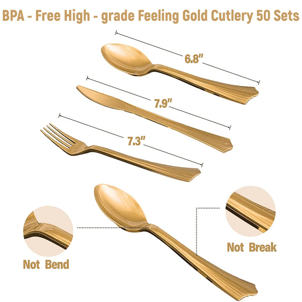 Serves 50 guests: This Party Tableware supplier includes 50 9-inch paper dinner plates, 50 7-inch paper dessert plates, 50 9-ounce paper cups and lunch napkins (3-ply, measures 6.5 x 6.5 inches) x 50, and 50 sets of sturdy gold plastic cutlery (50 spoons, 50 spoons, 50 spoons, 50 knives).
