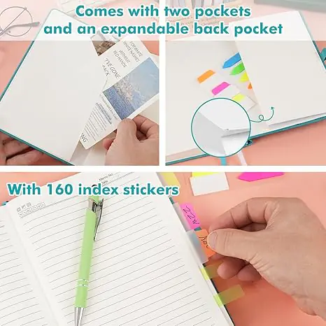 Comprehensive Features: Includes 150 sheets, pockets, pen holder, and stickers.